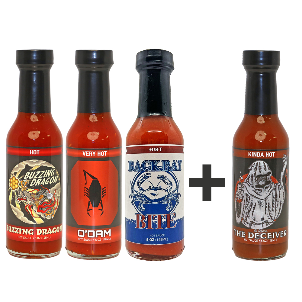 Four 5oz bottles of craft hot sauce! Enjoy the Core Lineup of Buzzing Dragon, ODAM, and Back Bay Bite, plus St. Francis The Deceiver.
